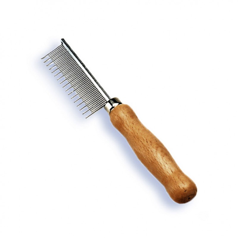 The smooth, rounded long teeth penetrate deep into the undercoat, while the short teeth collect loose hair. The Safari Shedding Dog Comb with rotating pins gently pulls though the coat. Begin combing from the head, working toward the tail and down the legs. Comb small sections at a time, always combing in the direction of hair growth until all tangles are removed.
