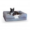 The base is made from orthopedic foam with a dreamy, polyester fluffy filled pillow top. The bolsters just add more comfort and chin support for the pets that like to hang their heads on an elevated spot. The bed has zippers for both the base and the bolsters so it can be broken down and machine washed. Binding on the bolsters adds a bit of class to this heavenly bed.